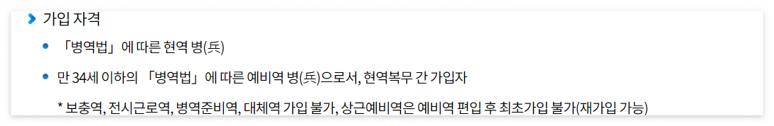 군인공제회 적금은 현재 군 복무 중인 병사들뿐만 아니라 전역 후 34세 이하의 예비역 병사도 가입할 수 있습니다. 다만, 예비역 병사가 이 적금에 가입하려면 군 복무 중에 이미 군인공제회 적금에 가입한 이력이 있어야 합니다. 그리고 이 적금은 만기(적금 기간이 끝나는 시점) 후에 재가입이 불가능하므로 처음 가입할 때 신중하게 계획을 세우는 것이 중요합니다.