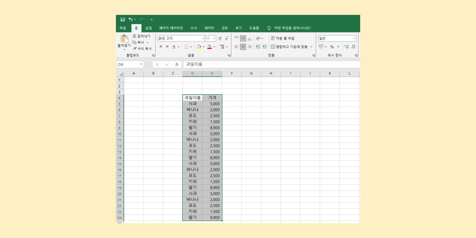 먼저, 중복을 제거할 데이터 범위를 선택해야 합니다. 이 범위는 하나의 열일 수도 있고 여러 열일 수도 있습니다. 예를 들어, 과일 목록에서 중복된 과일 이름을 제거하려면 과일 이름이 있는 열을 선택합니다.