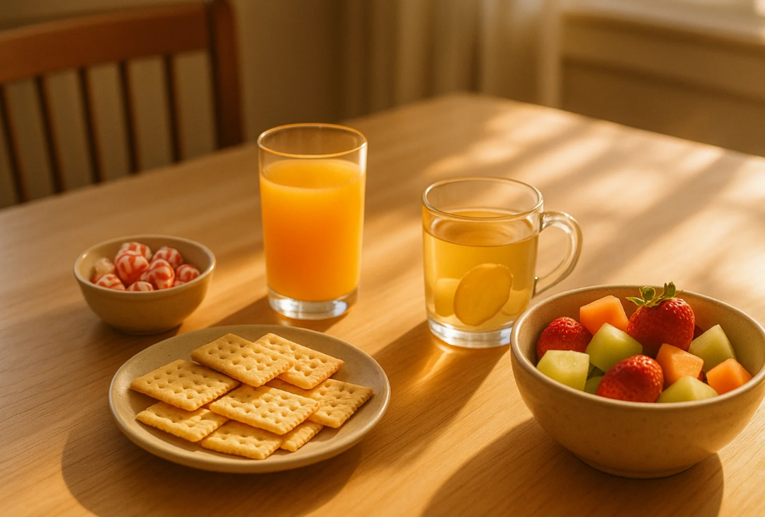 음료 및 차 오렌지 주스, 탄산수, 생강차, 레몬수 산미로 메스꺼움 완화 유도