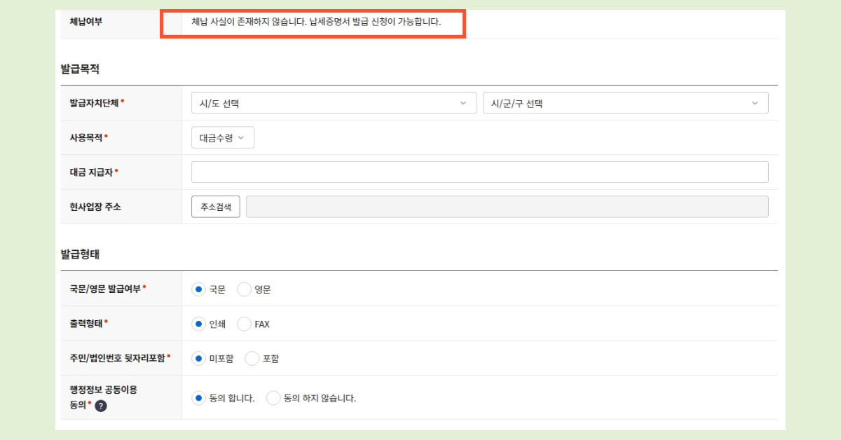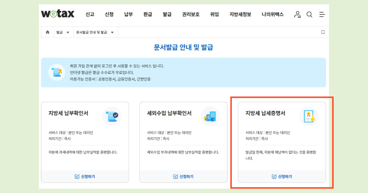 - 증명서 발급 메뉴 선택: 로그인 후 '증명서 발급' 메뉴로 이동하여 '지방세 납세증명서'를 선택합니다.