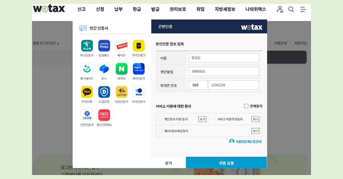 - 로그인: 간편인증 또는 공동인증서(구 공인인증서)를 사용하여 로그인합니다.