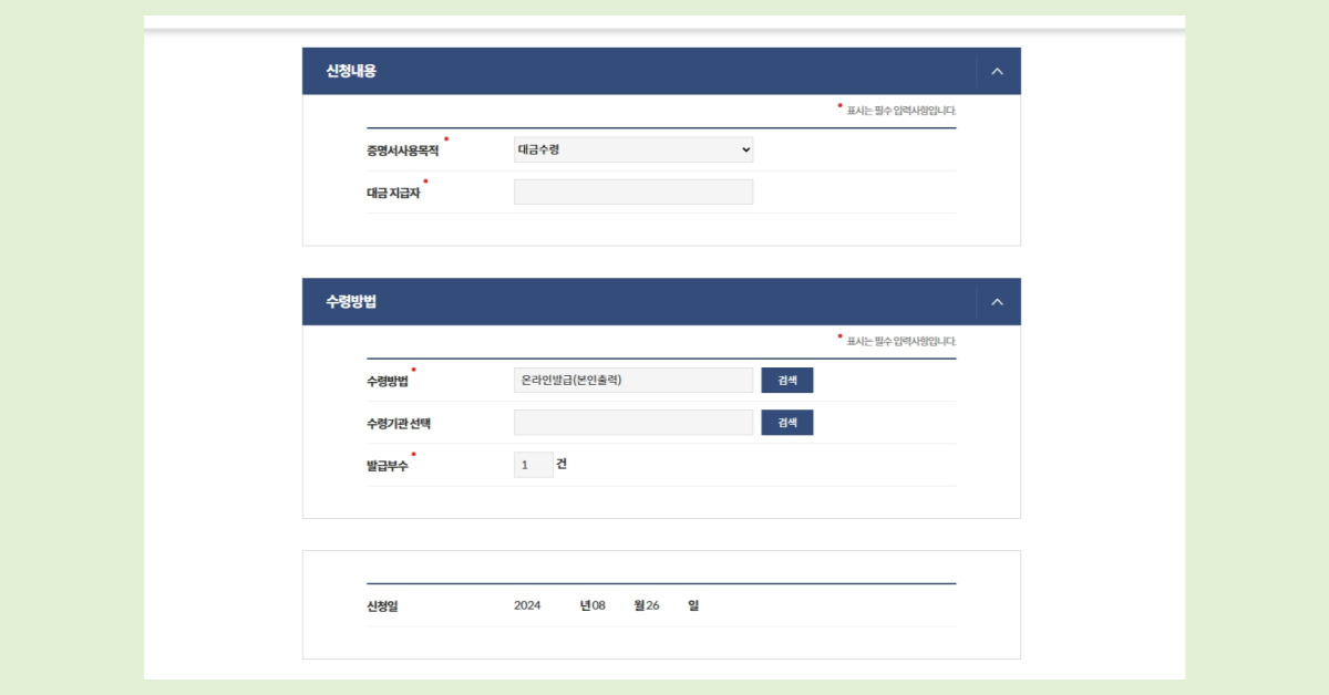 - 정보 입력: 주소와 필요한 목적 등을 입력하고 발급 부수를 선택합니다.
