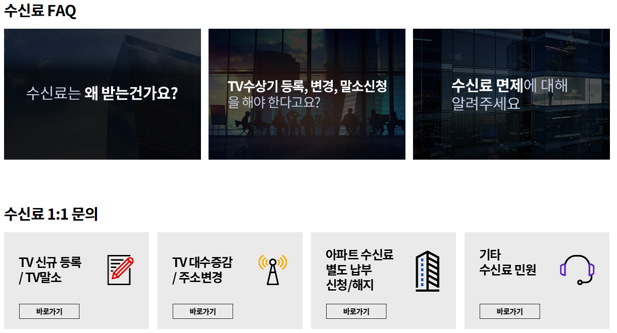 - 1:1 문의: 수신료 페이지로 이동한 후, 페이지 하단까지 스크롤을 내립니다. "수신료 1:1 문의" 메뉴를 찾아 "TV 말소 바로가기" 버튼을 클릭합니다.