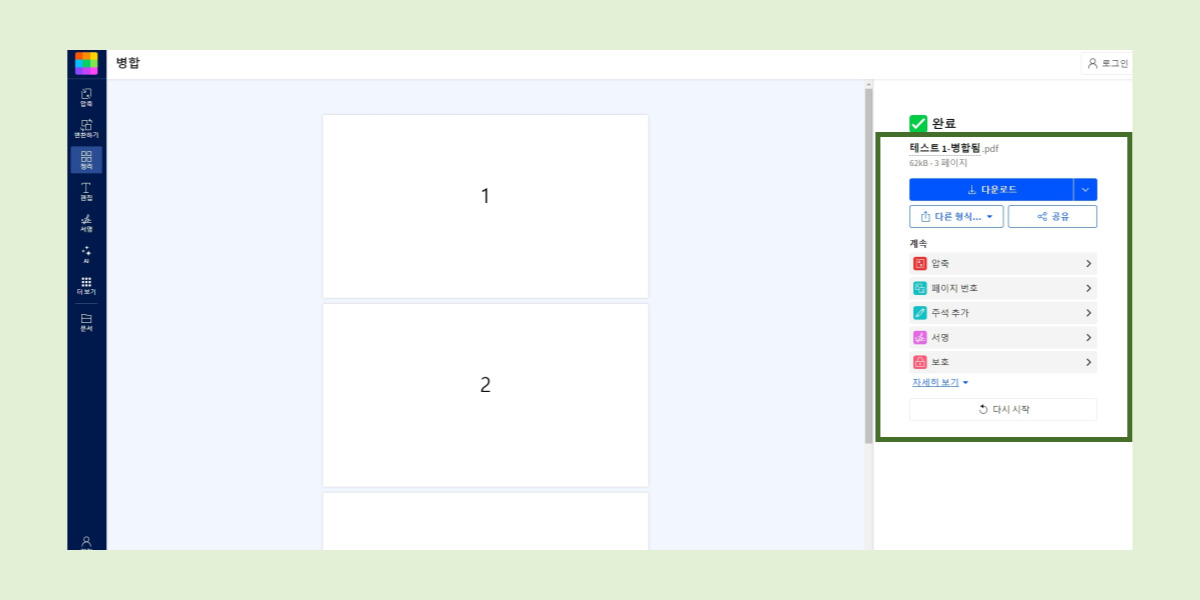- 파일 다운로드: 합치기 작업이 완료되면 합쳐진 PDF 파일을 다운로드합니다.