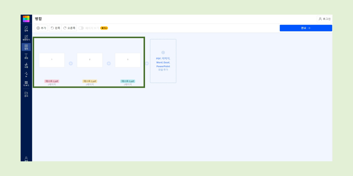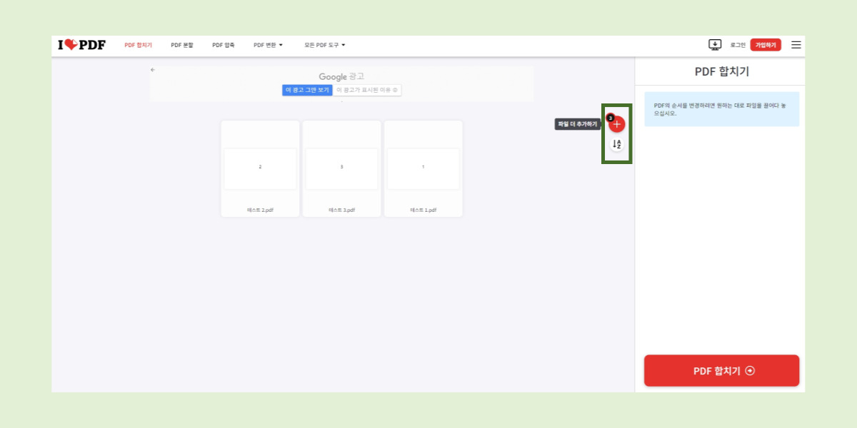 - 파일 업로드: 합치려는 PDF 파일을 업로드합니다. 이때 드래그 앤 드롭 방식을 사용할 수 있습니다.