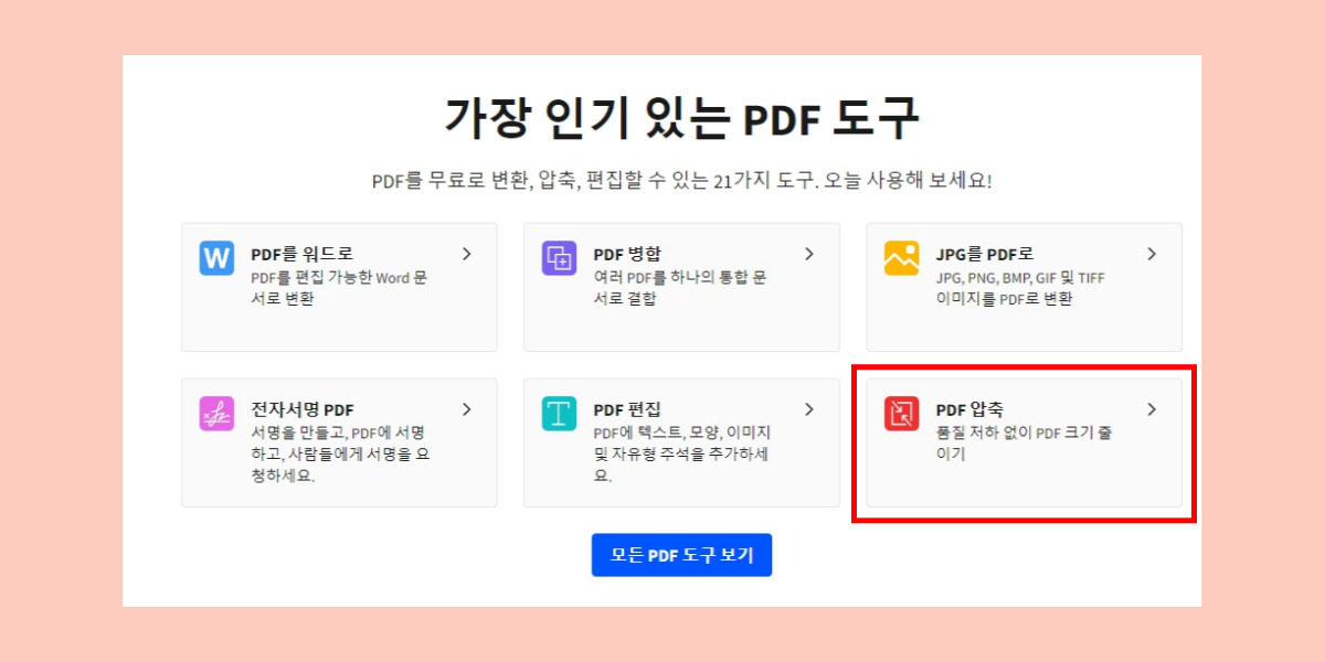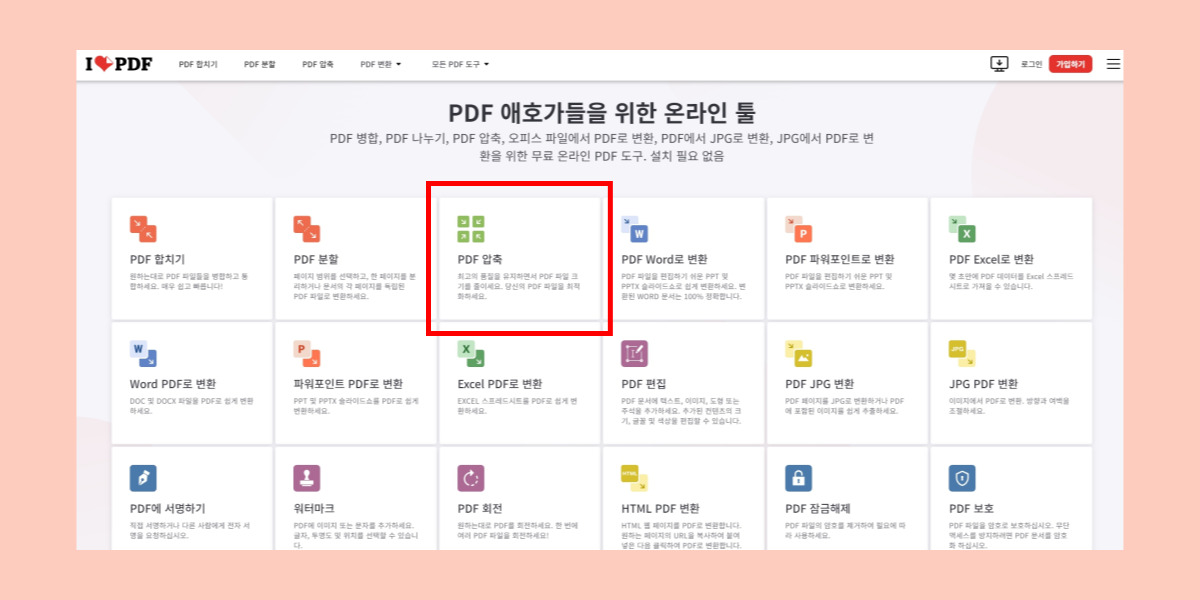 - 메인 페이지에서 스크롤을 내려 "PDF 압축" 옵션을 찾습니다.