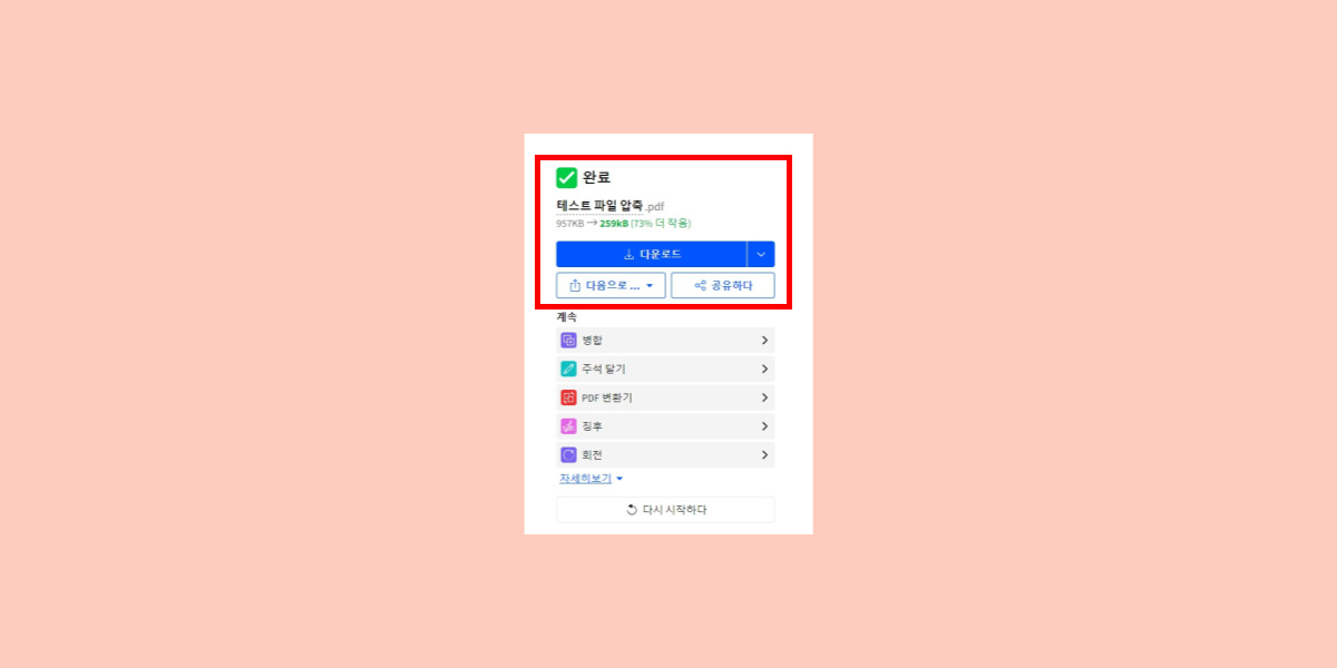 - "PDF 압축" 버튼을 클릭하여 파일 용량을 줄입니다.