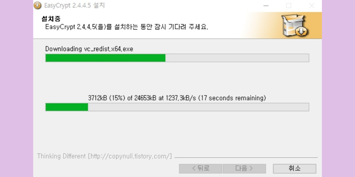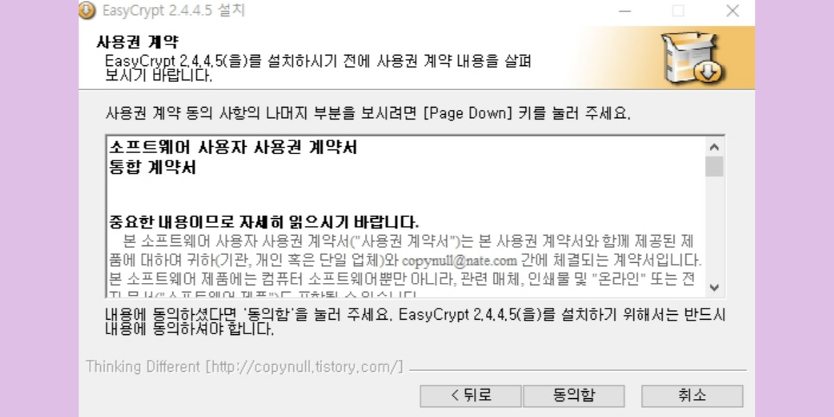 사실 이지 크립트(EasyCrpt) 설치는 어렵지 않습니다. 이지 크립트(EasyCrpt)를 다운로드하면 exe 확장자로 된 설치 파일이 생기게 됩니다. 이를 더블클릭하여 설치를 시작합니다.